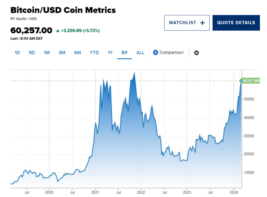 Το Bitcoin συνέχισε την άνοδό του σήμερα Τετάρτη, ξεπερνώντας και τα 60.000 δολάρια, για πρώτη φορά από τον Νοέμβριο του 2021.