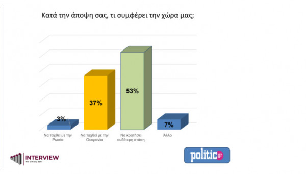 Μάλιστα, υπέρ της ουδέτερης στάσης της χώρας μας δηλώνει η πλειοψηφία των ερωτηθέντων. Συγκεκριμένα, το 53% θεωρεί ότι το ελληνικό συμφέρον εξυπηρετείται μέσω της ουδετερότητας. Ωστόσο, όσοι πιστεύουν πως συμφέρει την Ελλάδα να ταχθεί υπέρ μίας πλευράς, προκρίνουν πως αυτή πρέπει να είναι η ουκρανική (37%), ενώ μόλις το 3% υποστηρίζει τη στήριξη στη Ρωσία.