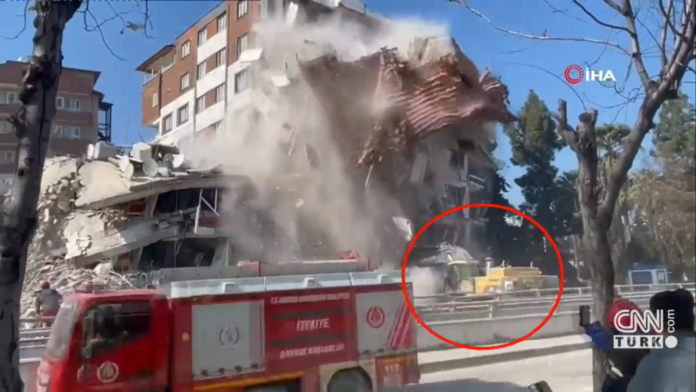 Από θαύμα γλύτωσε ένα οδηγός εκσκαφέα στην επαρχία Χατάι καθώς την ώρα που απομάκρυνε μπάζα από πολυκατοικία που είχε υποστεί ζημιές από τον φονικό σεισμό, το κτίριο άρχισε να καταρρέει σαν χάρτινος πύργος.